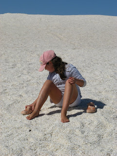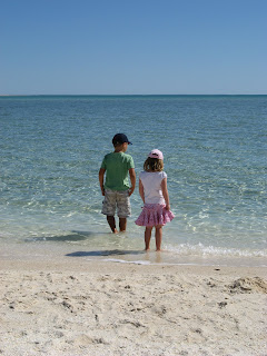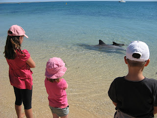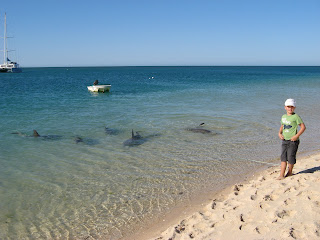 We spent a week at Denham in the heart of World Heritage listed Shark Bay. This was our western most stop of the trip. The waters here were again a beautiful aquamarine colour and crystal clear. Fishing (with very little success) and shell collecting were the key pastimes. On three occasions we drove to nearby Monkey Mia (a very small resort village). Here we got to enjoy the renowned dolphin visits. We were thrilled to see a six day old dolphin with it's mother in the close shallows on a number of occasions. One afternoon a group of dolphins came in to the shallows in search of fish. They would swim around slowly then dart off in pursuit of a meal. Harrison managed to catch up with them on a nearby sandy point. We weren’t sure if he was more excited about the fish or the dolphins splashing about! We hired a small glass bottom battery operated boat which was fun. Tim and Kate jumped in together and went stingray hunting.
