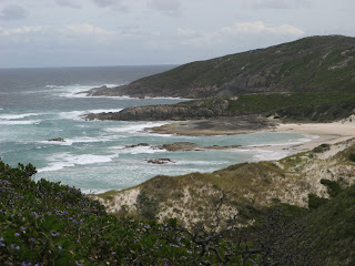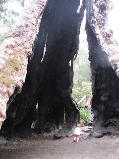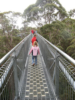 From Fremantle we headed southeast to Walpole. This area is marked by lush greener than green farming land and tall forests. We stayed on the Nornalup Inlet in a great camp-style park with outdoor fire etc. We visited the impressive Giant Tingle Tree where Hannah asked “Is this the big fruit tingle tree?” (a favoured Smead travelling treat!). The Valley of the Giants tree top walkway was a thrilling experience. This suspended steel walkway spans some 600 metres and reaches a peak of 40 meters above the forest floor. Harrison, Kate and Hannah walked it first. The kids merrily bounced along, undeterred by the swaying of the walkway. Kate had to keep her eye on the walkway or the canopy line as the view down was a little too much. Tim completed the walk separately as Annabelle and Georgie were not so keen. We drove to some gorgeous coastal bays and rugged headlands as well as inland pools and falls. Our fond memories of Walpole will be those of lushness and wetness. We received a fair amount of rain during our two day stay here. (Life is so much harder in the van when wet, especially when we don’t have the annex up. We just can’t spread outside which we really need to be able to do with six!)